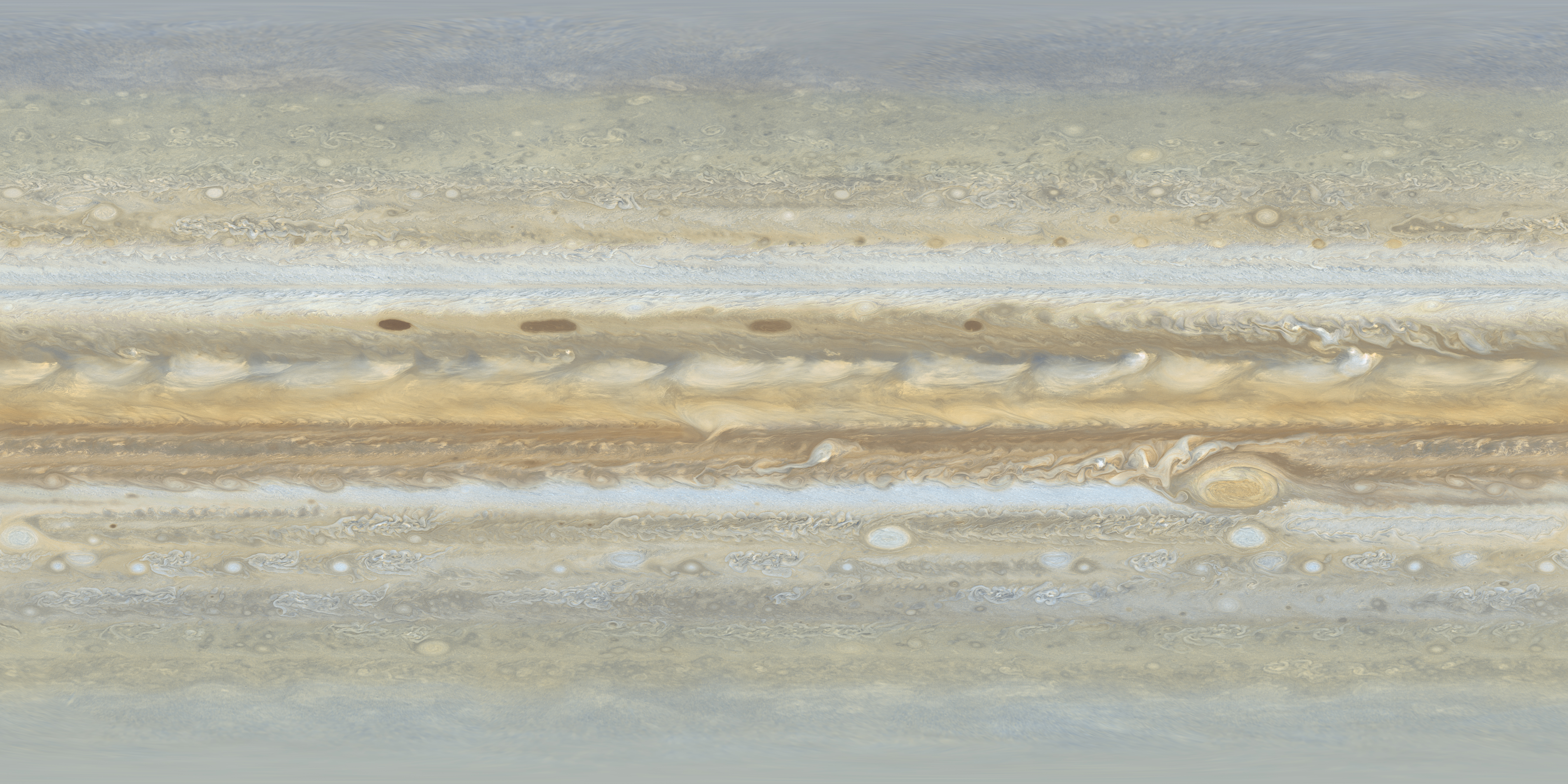 This map of Jupiter was created from 270 images obtained by the Voyager 1 spacecraft on February 27, 1979 from a distance of about 7.5 million km. Latitudes are planetographic with a uniform interval from -90 (bottom) to 90 (top). Longitudes are in System III with longitude 0 at the left/right edges of the map and longitude 180 at the center. The map should be rendered by projecting it onto an ellipsoid with an equatorial radius of 71516 km and a polar radius of 66871 km or some equivalent units. Below is more detailed information about the map.