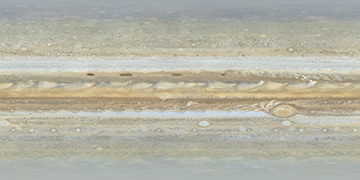 Needless to say, the error is larger where images from the start and end of the imaging sequence overlap. These images were obtained about 9 hours apart. This resulted in an obvious seam near longitude 255 that I removed manually. I first carefully modified the seam's location in the overlap area to include uniform areas where possible and not any major high contrast features like prominent spots. A sample of the seam before I removed it manually can be seen below (click the image for the full size version). The left overlapping image has been darkened to make the seam more obvious but as can be seen, even without manual modifications the seam is rather subtle at most locations.